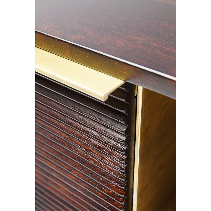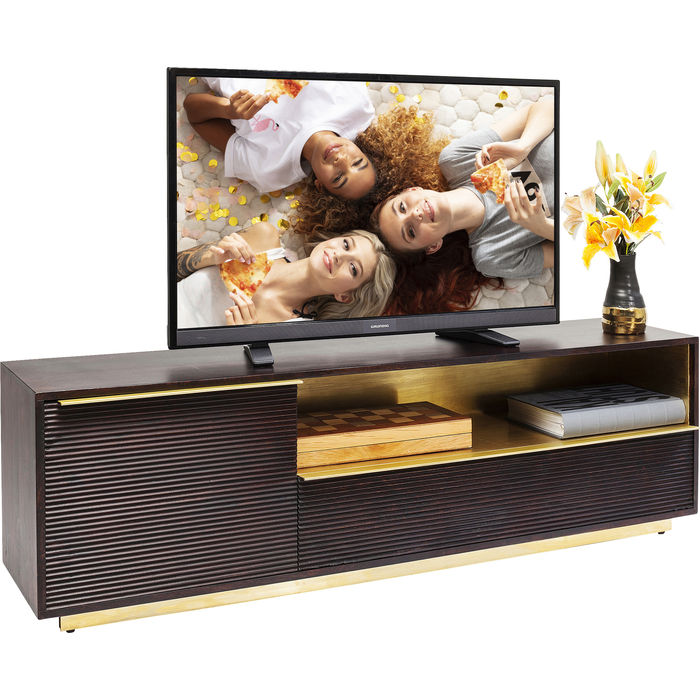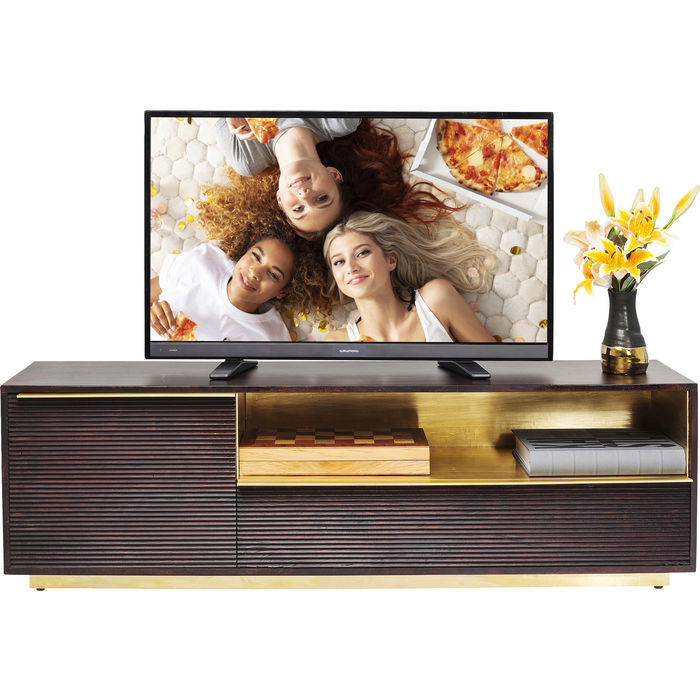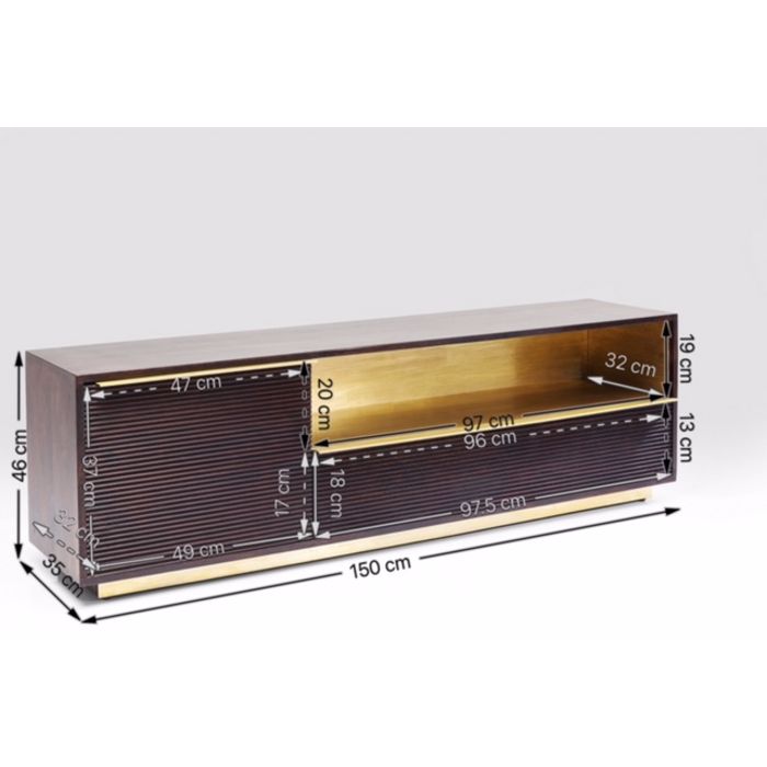 TV komoda koja podsjeća na interijer iz hotela s pet zvjezdica. Ručno izrađena komoda od masivnog drveta manga s elegantnim detaljima poput otvorenog zlatnolakiranog pretinca. Ova komoda je veoma elegantna i ne nametljiva. Nadopunjuje moderan namještaj, a može poslužiti i kao komoda u uredu.