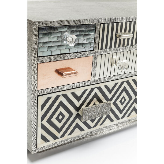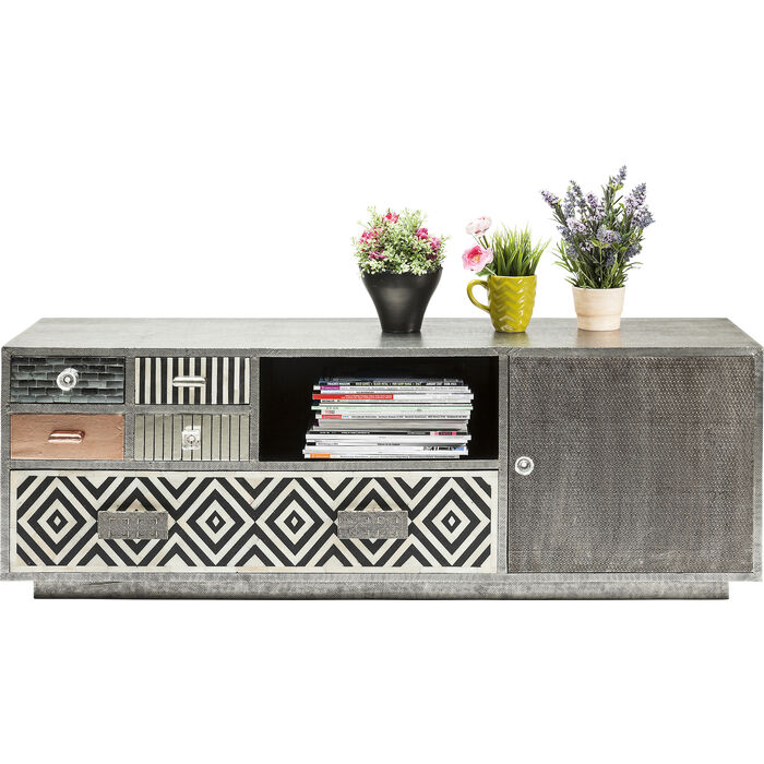 Ovo izrvsno, visokokvalitetno umjetničko djelo koje predstavlja kombinaciju kamena, stakla i metala, savršeno je za svaku sobu. Okvir je prekriven iskovanim metalom, a 5 ladica i jedna vrata ukrašeni su složenim ukrasima. Okvir od drva manga ručno je brušen do finog završetka. Pojedinačni djelovi komode, fronte ladica i noge prekriveni su sjajnom srebrnastom metalnom folijom. Završno lakiranje vašem jedinstvenom komadu daje suptilan i glamurozan sjaj. Postavite svoj TV na savršenu komodu za svaku prostoriju vašega doma.
