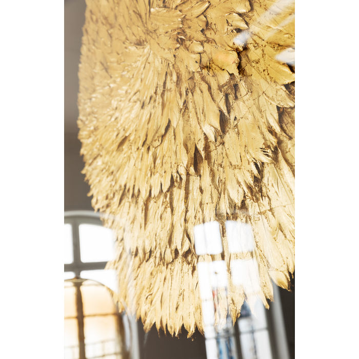 Okvir sa zlatnim guščjim perjem. Dekorativni okvir vješto stvara žarišnu točku na zidu. Perje oblikovano u puževu školjku istovremeno pruža gracioznost i glamur. Ovaj okvir pruža snažan kontrast pozadini.