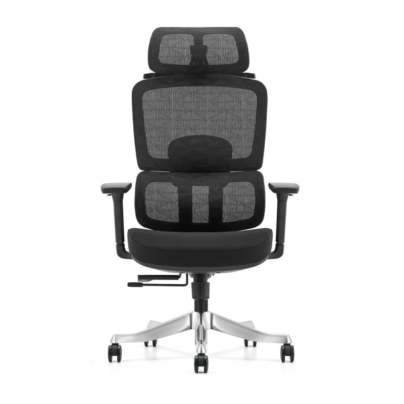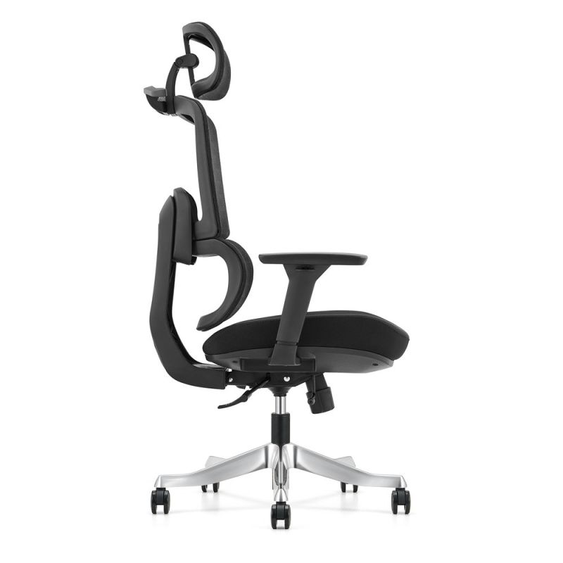 Ergonomska uredska stolica u crnoj boji, prikladna za ured budućnosti! Stolica je i rotirajuća i podesiva po visini, s plinskim mehanizmom u glavnom stupu, te nudi nekoliko dodatnih opcija za ergonomsko prilagođavanje. Naslon stolice presvučen je prozračnom mrežastom tkaninom i opremljen je mehanizmom koji omogućuje podešavanje visine samog naslona, neovisno o glavnom plinskom mehanizmu za podizanje. Naslon također ima podesivu lumbalnu potporu, 2D podesivi naslon za glavu i ugrađenu vješalicu za odjeću na koju možete objesiti jaknu ili drugu odjeću. Crni nasloni za ruke izrađeni su od PU i podesivi su u tri dimenzije. Mehanizam s više položaja s klizačem omogućuje podešavanje odgovarajuće dubine stolice po želji.