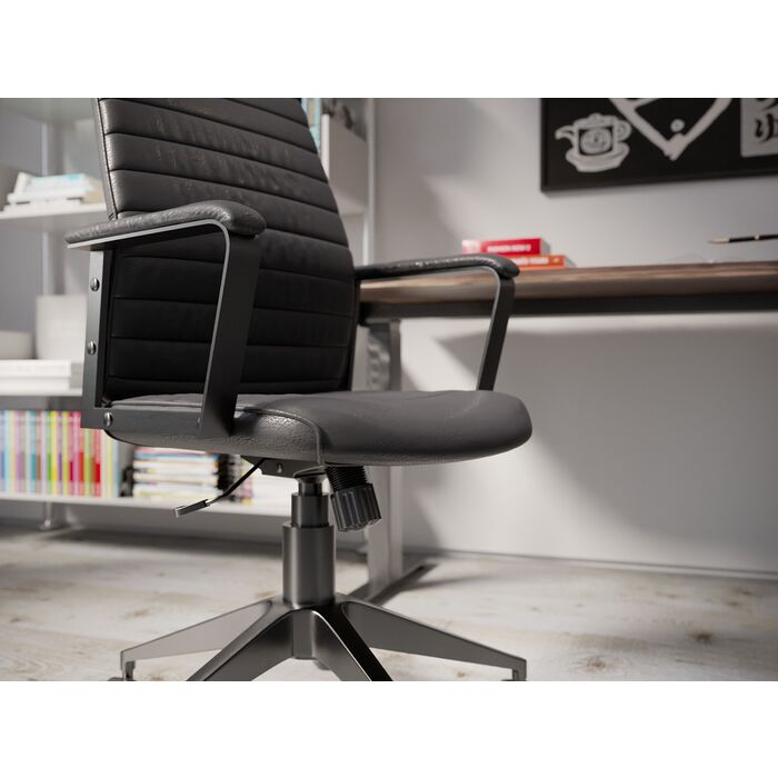 Okretna uredska stolica u ekskluzivnom crnom izgledu. Osim impresivnog izgleda i udobne presvlake, dolazi na pet kotačića i savršena je za bilo koga po visini. Niski rukonasloni, visoki leđni naslon i mekane presvlake osiguravaju optimalnu udobnost sjedenja. Kožna presvlaka jednostavna je za njegu i može se prebrisati vlažnom krpom.
