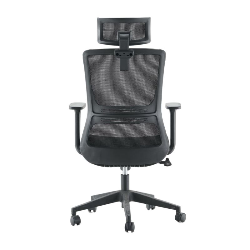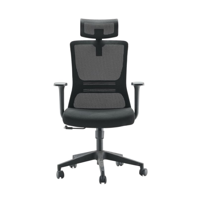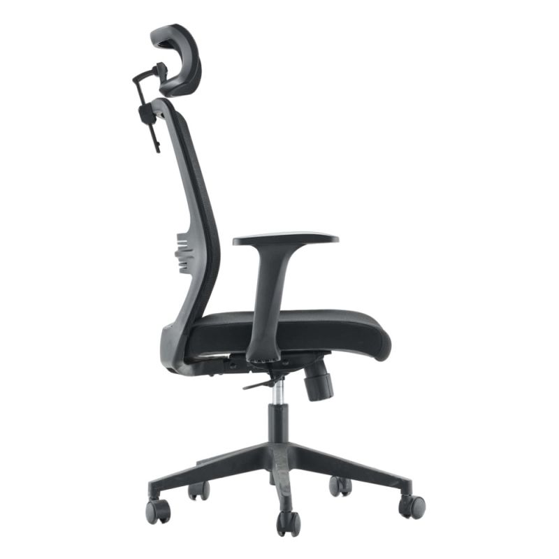 Udobna uredska stolica, dostupna u crnoj boji. Stolica je okretna, podesiva po visini i ima ergonomski oblikovan naslon. Sjedalo je presvučeno prozračnom tkaninom, a naslon visokokvalitetnom mrežastom tkaninom za ventilaciju. Sjedalo je ispunjeno pjenom visoke gustoće za ugodnije sjedenje. Stolica je opremljena mehanizmom leptir za podešavanje nagiba. Naslon za glavu je podesiv po visini, nasloni za ruke su fiksni. Crna baza stolice izrađena je od polipropilena i ima 5 najlonskih kotačića.