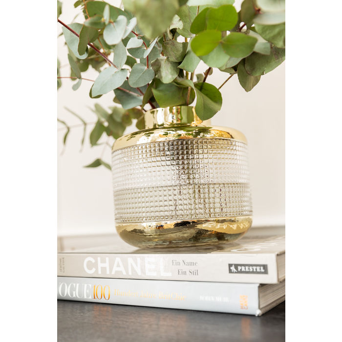 Mala vaza za cvijeće u uzbudljivoj dizajnerskoj mješavini stakla i zlatnih boja. Privlači pažnju svojom blistavošću na komodi ili polici.