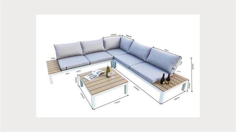 Bezvremenska elegantna kutna garnitura za vrt, terasu ili veliki balkon za uživanje u lijepom vremenu. Vanjska sjedeća garnitura s praktičnim površinama i stolom u drvenom obliku, otporna na vremenske uvjete i jednostavna za njegu. Presvlake jastuka imaju patentni zatvarač i mogu se skidati i prati. Omogućeno je udobno sjedenje zahvaljujući blago nagnutom naslonu od trajnog aluminija i raskošno tapeciranim jastucima za leđa.