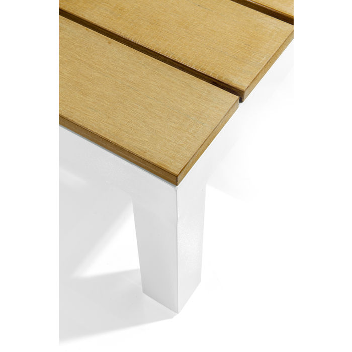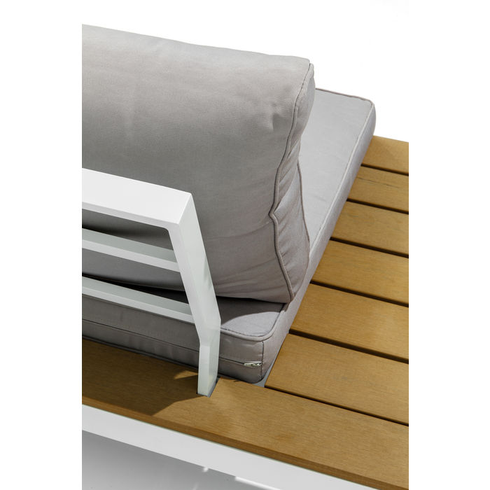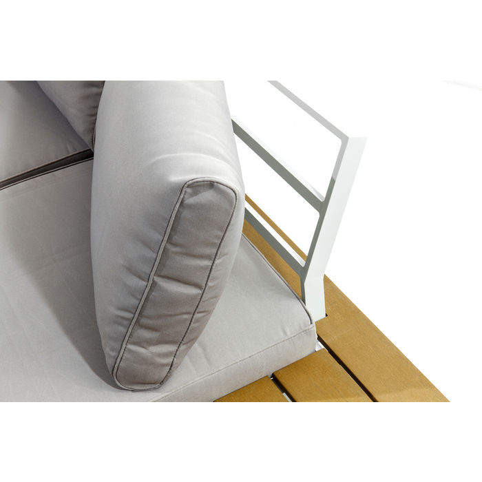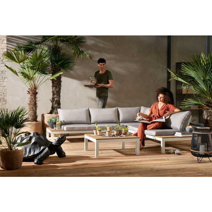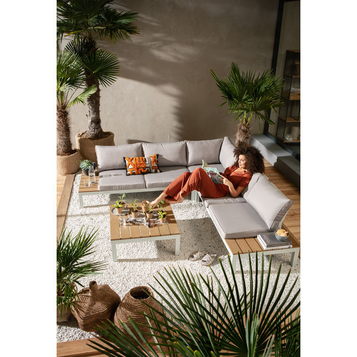 Bezvremenska elegantna kutna garnitura za vrt, terasu ili veliki balkon za uživanje u lijepom vremenu. Vanjska sjedeća garnitura s praktičnim površinama i stolom u drvenom obliku, otporna na vremenske uvjete i jednostavna za njegu. Presvlake jastuka imaju patentni zatvarač i mogu se skidati i prati. Omogućeno je udobno sjedenje zahvaljujući blago nagnutom naslonu od trajnog aluminija i raskošno tapeciranim jastucima za leđa.