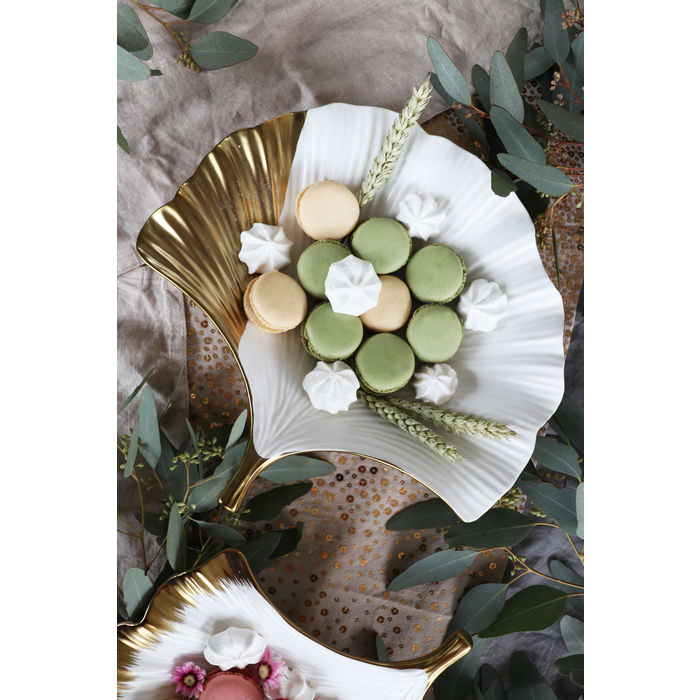 Ravna, bijela porculanska zdjela u obliku lista ginka sa zlatnim naglaskom. Elegantna zdjela koja daje prekrasan izgled komodi ili stolu. Zdjela je pogodna za pranje posuđa. Izuzetno simboličan dodatak za opremanje koji izgleda sjajno i bez ikakvog sadržaja, jer lišće ginka donosi sreću.