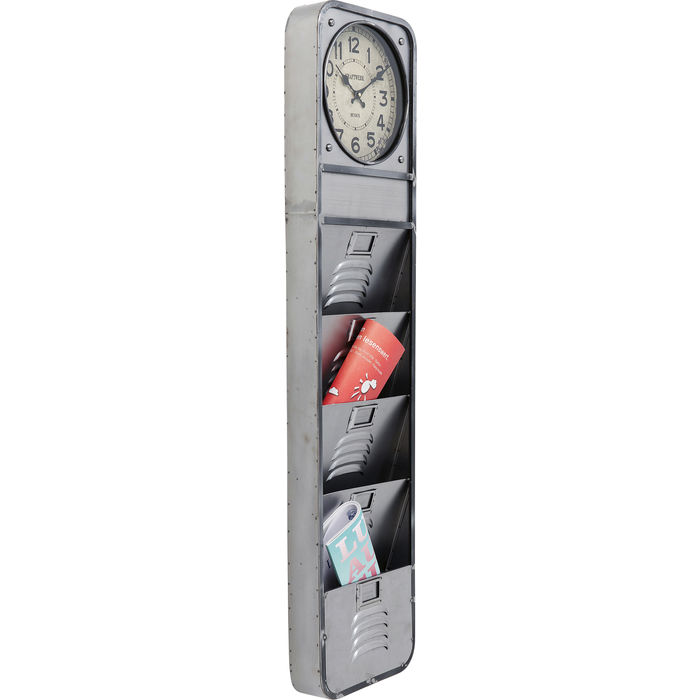 Zidni sat izrađen od metala u srebrnoj boji s praktičnim pretincima. Praktični pomagač za održavanje urednosti. Sat u šarmantnom vintage stilu radi na baterije. Četiri odjeljka za novine, časopise i pisma pomažu u održavanju reda, pa se može postaviti u čekaonice, hodnik itd.
